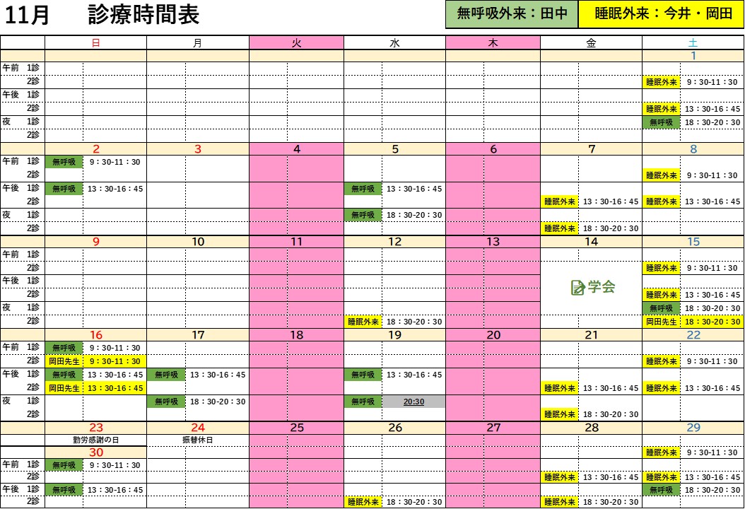 お知らせ2025.10.14 令和7年11月休診日のお知らせ 令和7年11月の診療時間表です。 火曜日・木曜日は休診、14日(金)は学会のため 休診させていただきます。ご確認のうえご来院ください。 シェアするShare お知らせ・コラム一覧