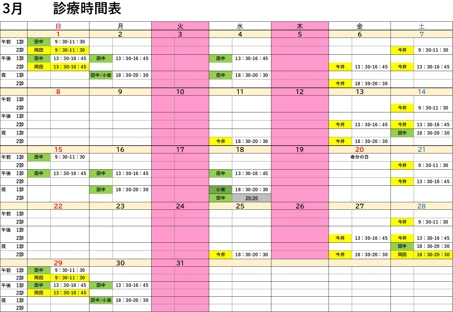 令和8年3月の診療時間表です。 ご確認のうえご来院ください。